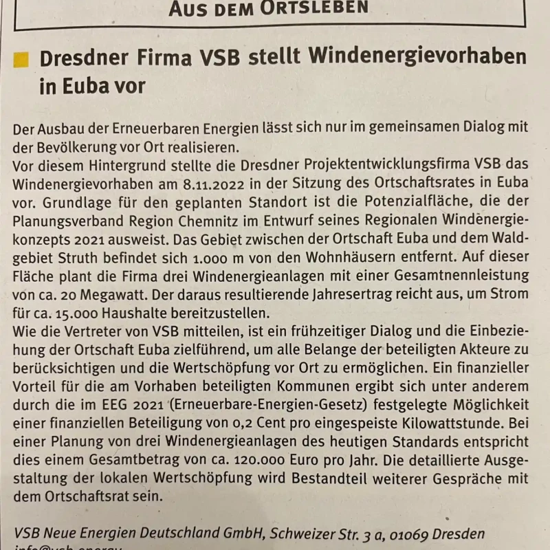 Auszug aus dem Eubaer Anzeiger über das Vorhaben