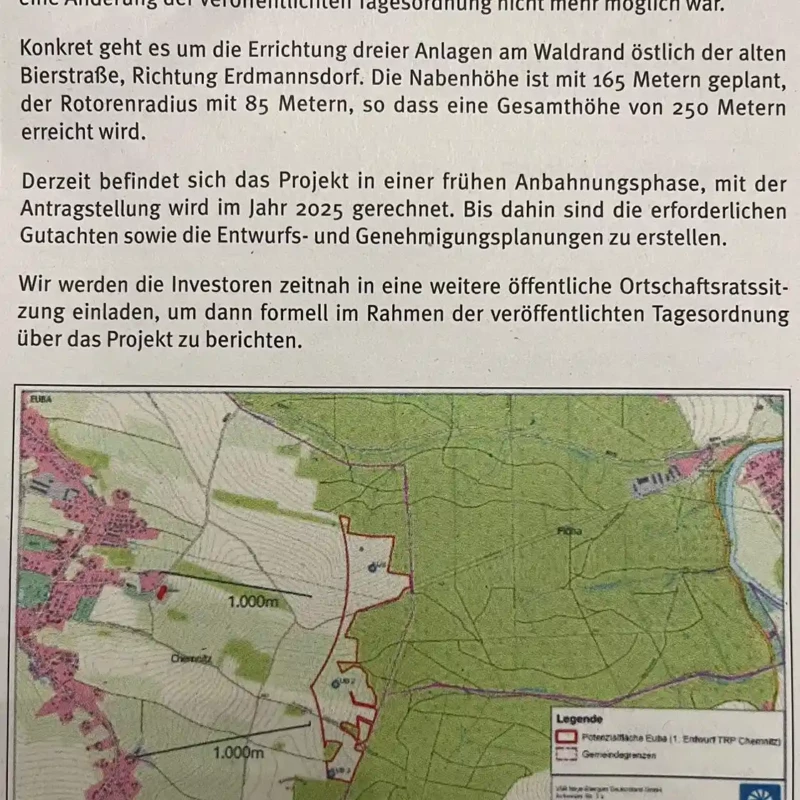 Stand 2024: Der Fußpunkt des geplanten Windrades EUB2 liegt auf dem Grundstück der Stadt Chemnitz. Nach Bürgerprotesten möchte die Stadt Chemnitz vorerst nicht an die VSB verpachten.